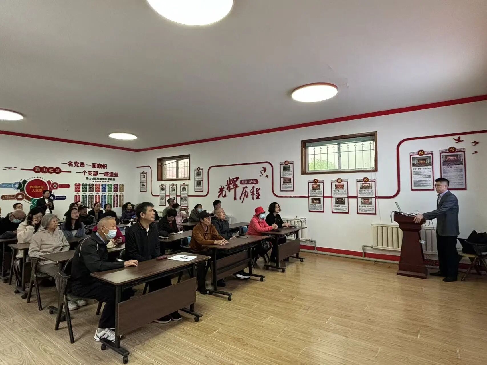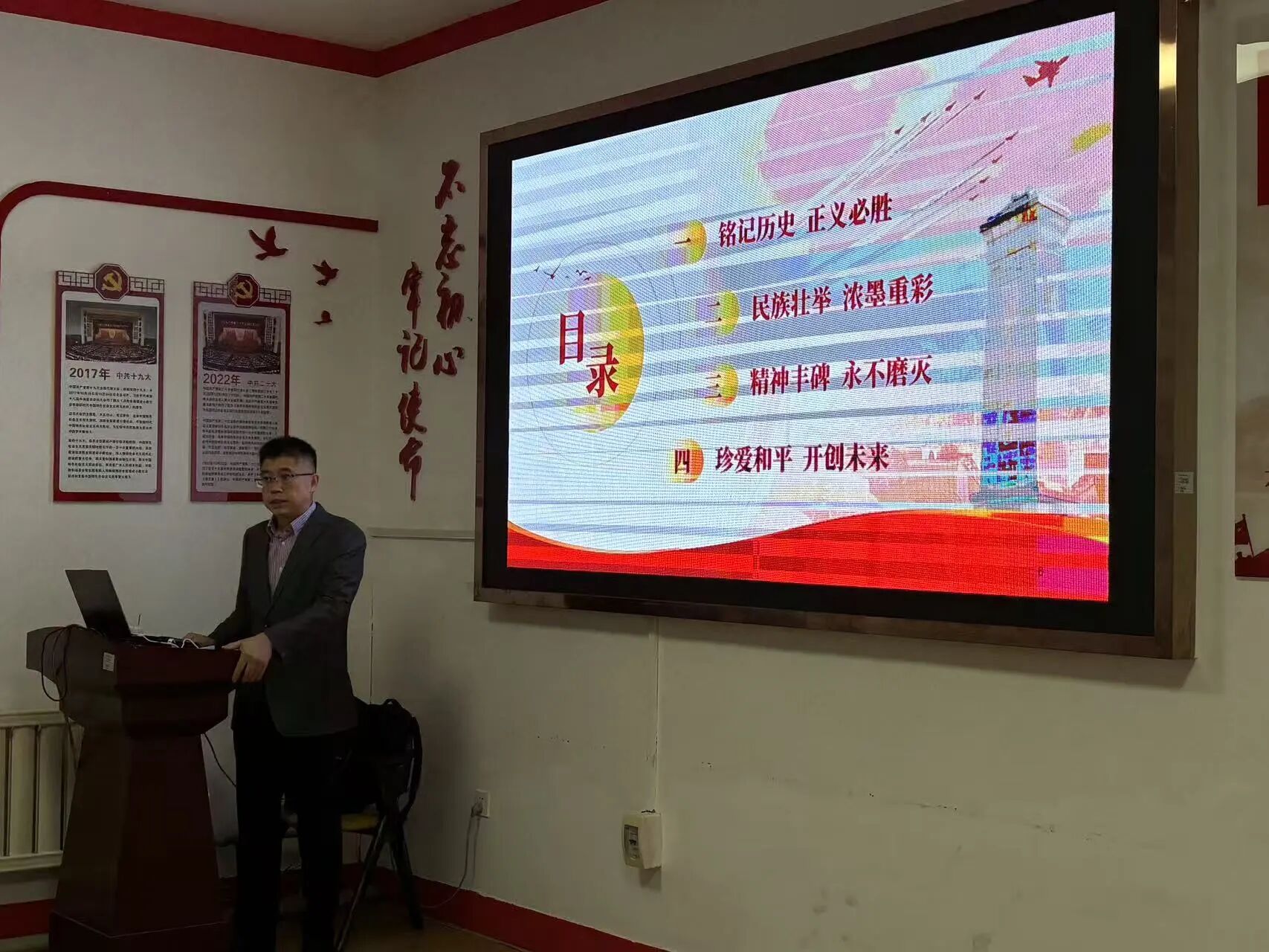 赵世平以历史发展为脉络,从四个维度展开深刻阐述。“铭记历史,正义必胜”部分,借助史料照片与战役故事,引领居民们缓缓回望那段充满苦难的抗战岁月;“民族壮举,浓墨重彩”部分,聚焦经典战役,通过细致的讲述,引发社区居民们强烈的情感共鸣;“精神丰碑,永不磨灭”部分,对伟大的抗战精神进行了深入解读,将其化作激励人们前行的精神动力;“珍爱和平,开创未来” 部分,呼吁大家以史为鉴,在当下的和平时代里,埋头苦干、勇毅前行。