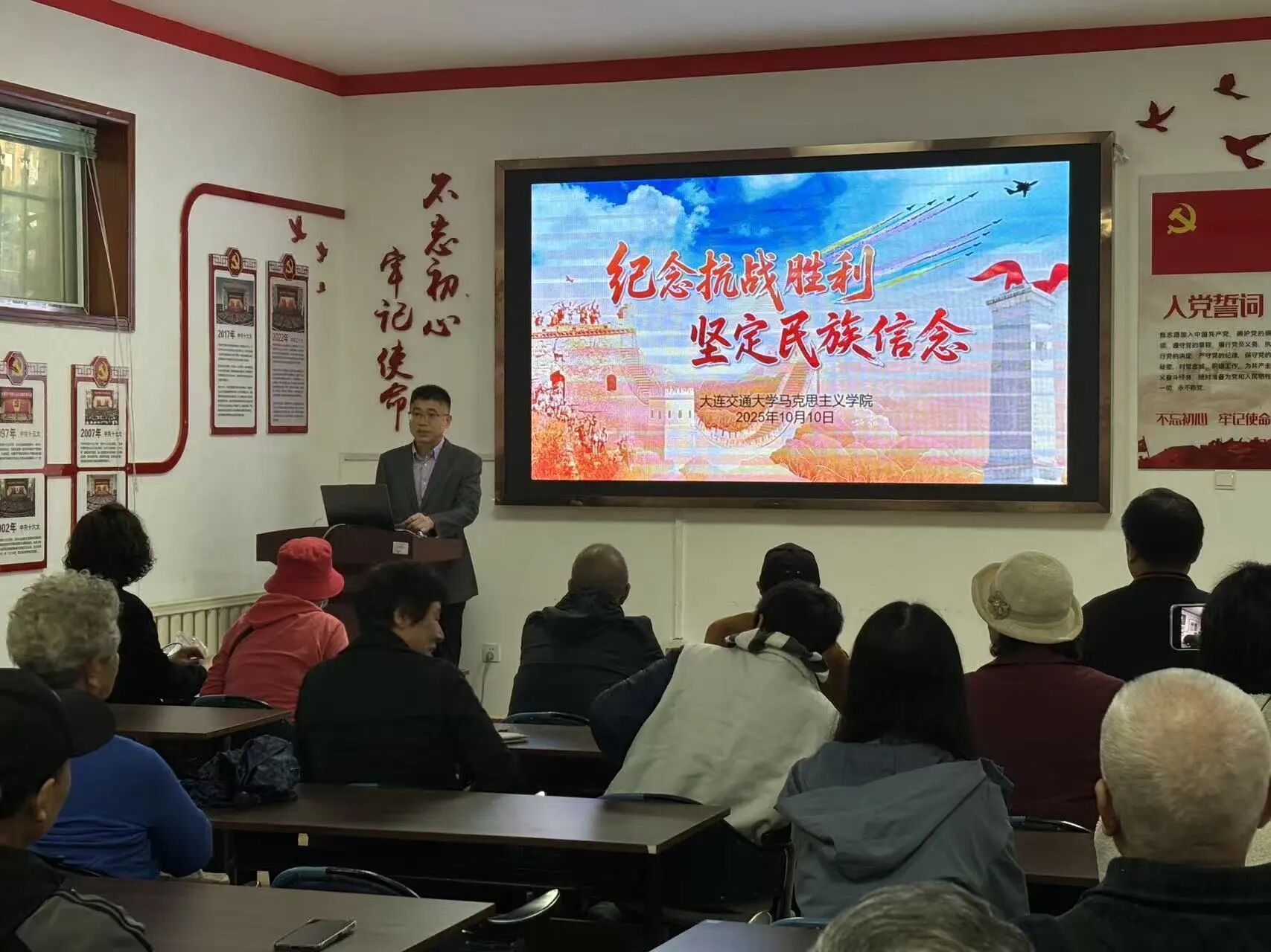 形势与政策教研室主任赵世平以“纪念抗战胜利,坚定民族信念”为主题开展宣讲,让承载着英烈精神与民族记忆的红色基因,在社区的文化土壤中深深扎根。