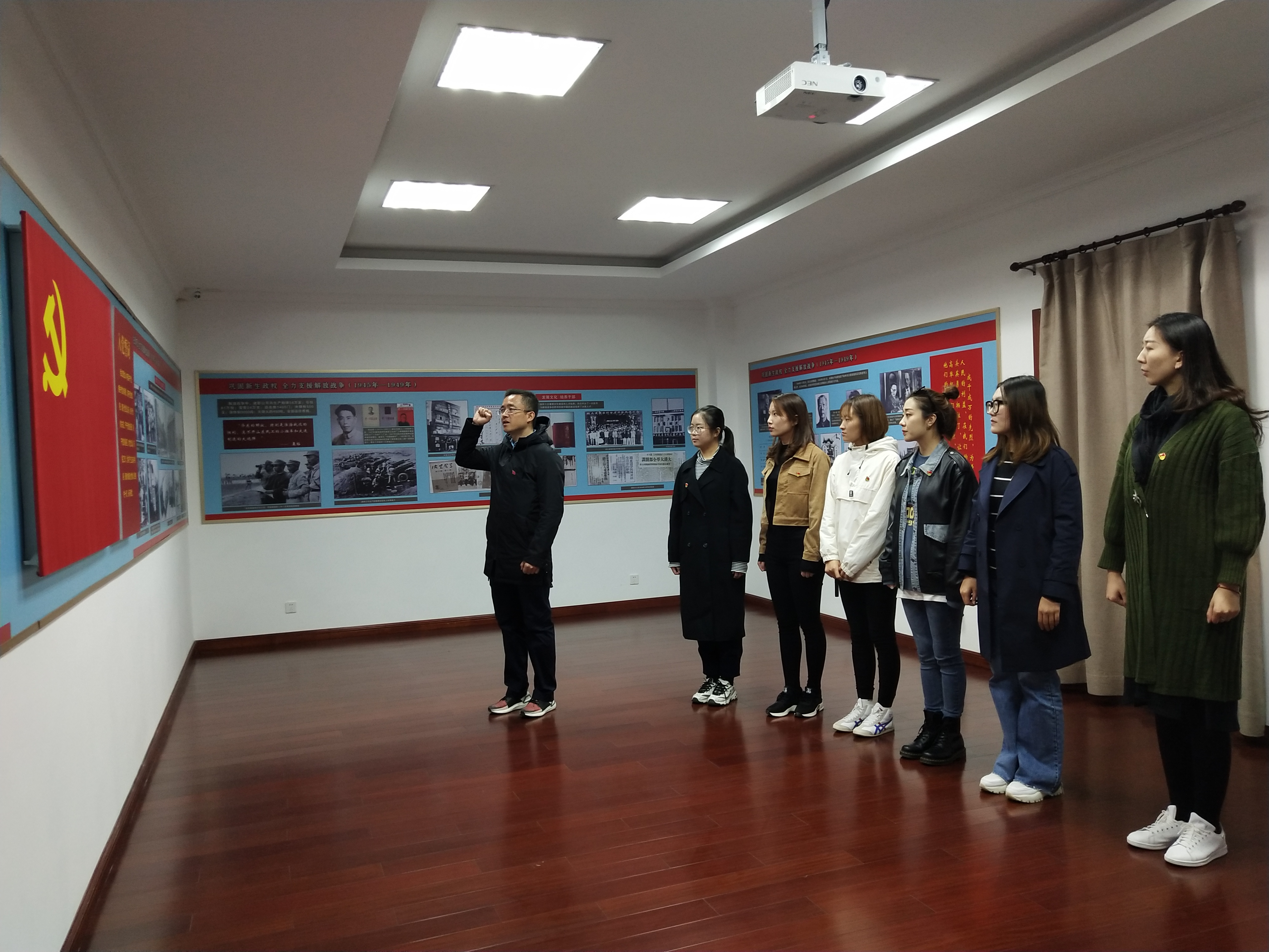 参观人员在基地讲解人员引领下,先后参观陈列室重点反映中华工学会活动、党领导下的福纺“4·27”大罢工等展室,认真学习历史资料,在活动结束之际,重温革命历史,重读入党誓词,践行党的初心和使命。