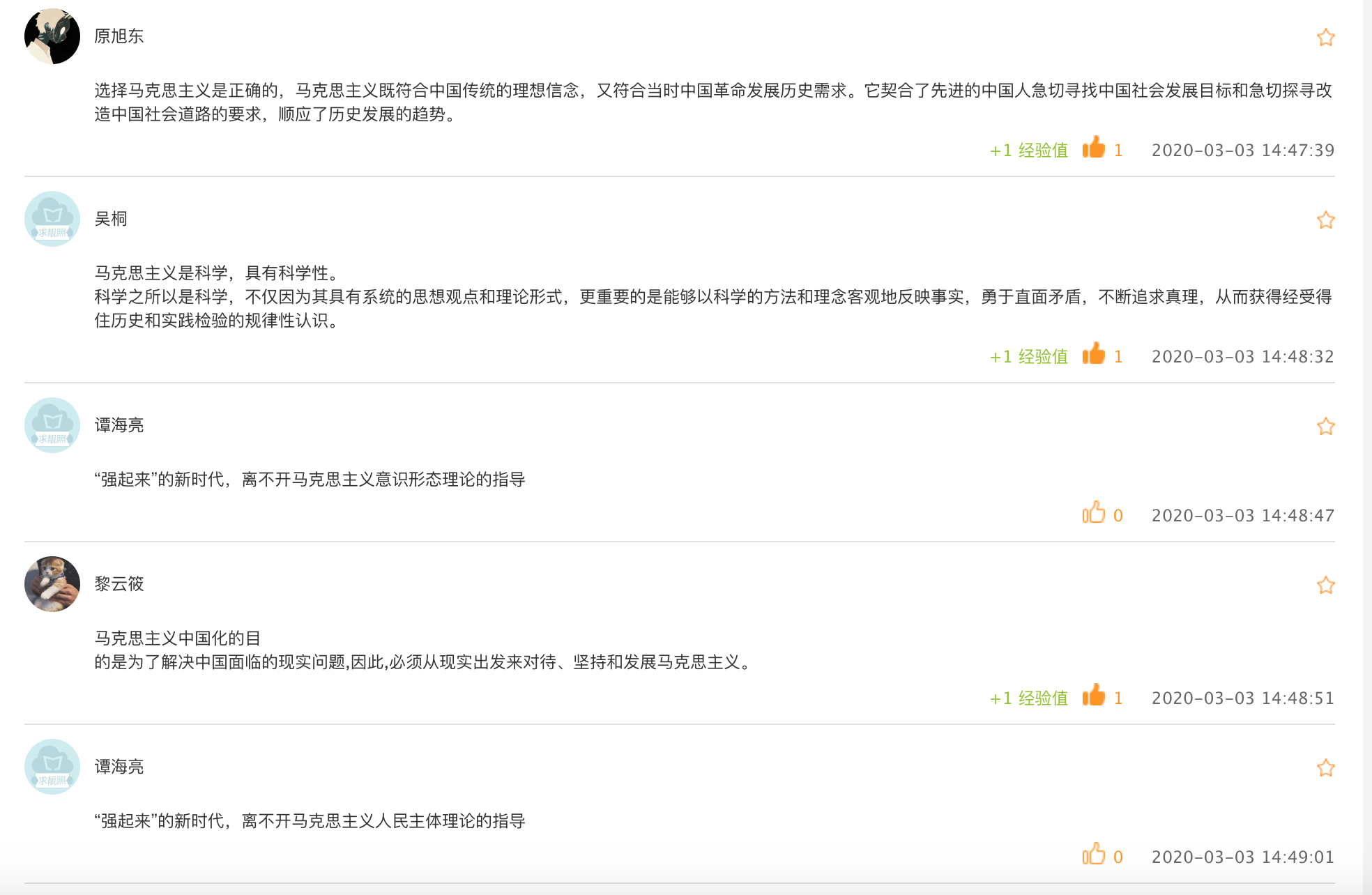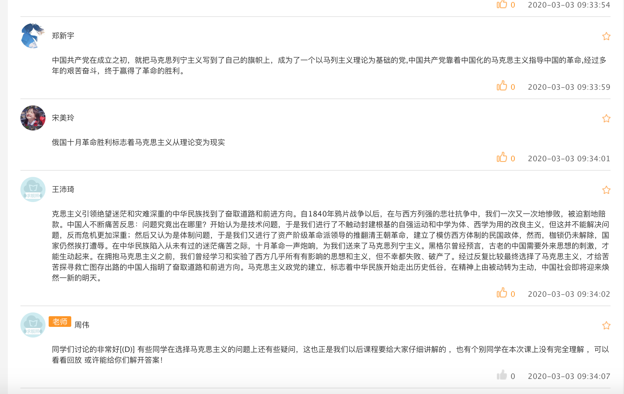 马克思说:“万事开头难,每门科学都是如此。”第一周的原理课在期待和紧张中结束了。一周下来,老师们线上授课基本上做到了秩序井然、节奏得当,学生线上学习也热情饱满、反馈良好。在线上教学过程中,我们有几点共同感受:(1)线上授课,虽然是特定疫情防控期间的短期教学活动,但其中包含的积极因素,如打破传统的教室局限、突破了知识的获得方式,从长期来看可能会对高等教育教学方式方法改革注入新的动力;(2)对学生而言,线上教学的实质就是“教师指导下的自主学习”,因此云课要体现“OBE”教学理念,实现教师角色转变,引导学生增强自主学习能力,把“以学生为中心”落实到整个教学活动过程之中;(3)开展线上教学,工具和平台的功能越简单,对于教师的要求就越高,但线上教学效果如何,归根到底还是取决于教师本人教学能力和水平,以及对教学目标、内容和方法的精心设计。