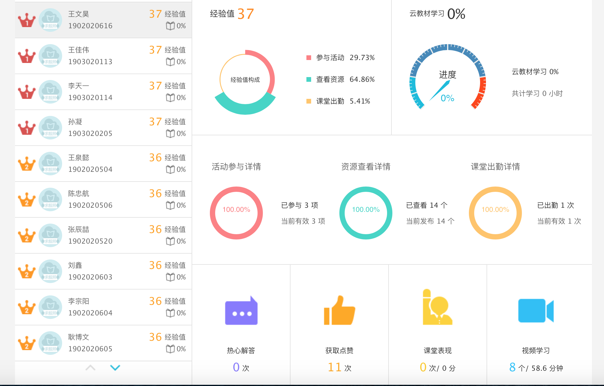 1. 利用云班课与微信群相结合,微信群发送相关信息通知,云班课开展线上课程教学及互动,包括精准发布相关的教学资源,进行形式多样的课堂活动,对各项活动赋予相应的经验值分,从而激发学生的兴趣,提高了学生的参与度。