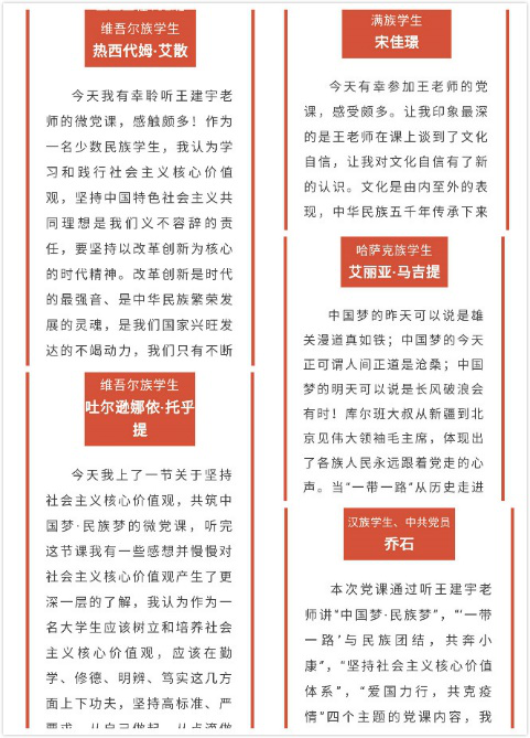 课后,机械工程学院少数民族同学和学生党员纷纷留言,以课后感形式总结学习心得。例如少数民族学生谈到,王老师提到的库尔班大叔骑毛驴从新疆到北京见毛主席的故事,从中感受到了中华民族的精诚团结。而且库尔班大叔的后人,在2020年3月10日为武汉捐献5吨新疆大米。可见民族情是一种爱的传承,汉族离不开少数民族,少数民族离不开汉族。