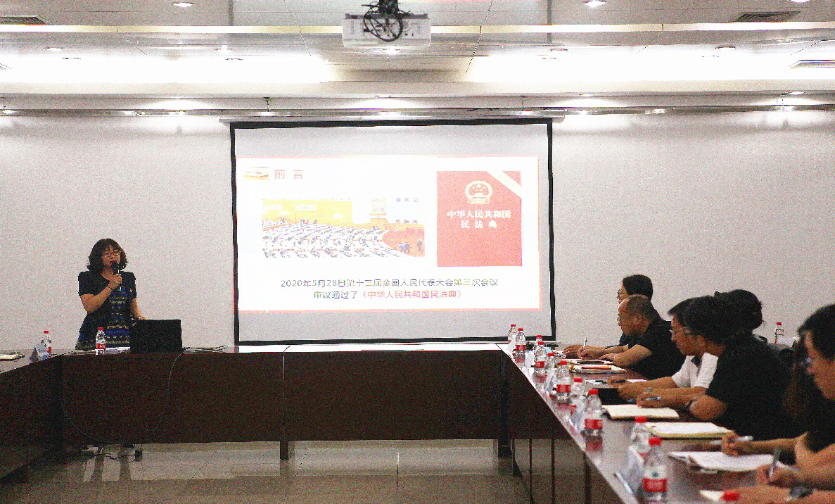 思想道德修养和法律基础教研室李先教师(兼职律师)在学习会上进行民法典的解读汇报。