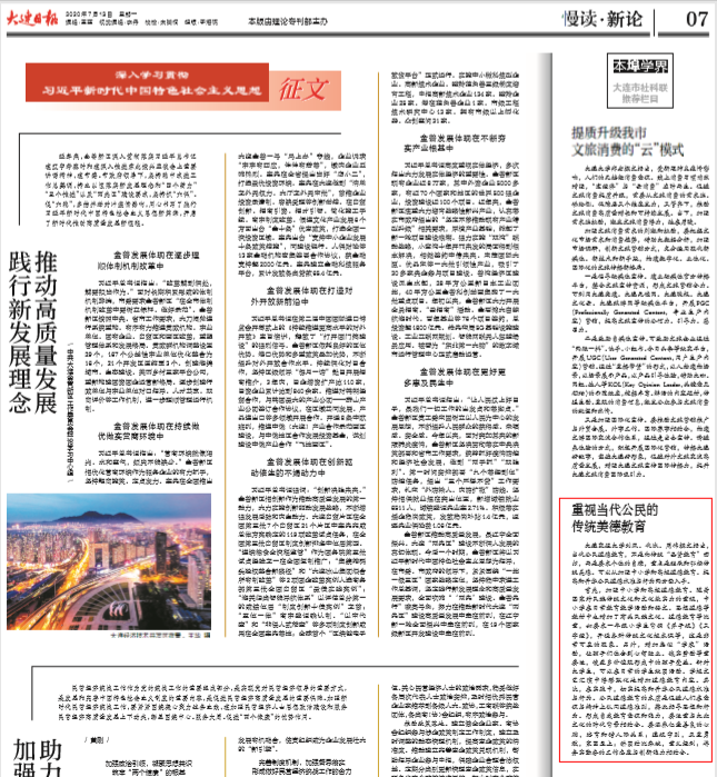 刘凤等老师的市社科联课题成果“大众文化时代的公民道德教育”咨政建议在《大连日报》本埠学界“市社科联推荐栏目”上节选刊发。课题研究认为,我们“应当重视当代公民的传统美德教育”,当下公民道德教育不是向传统“圣贤教育”回归,而是要求个体的自律,重点是继承和弘扬传统美德。