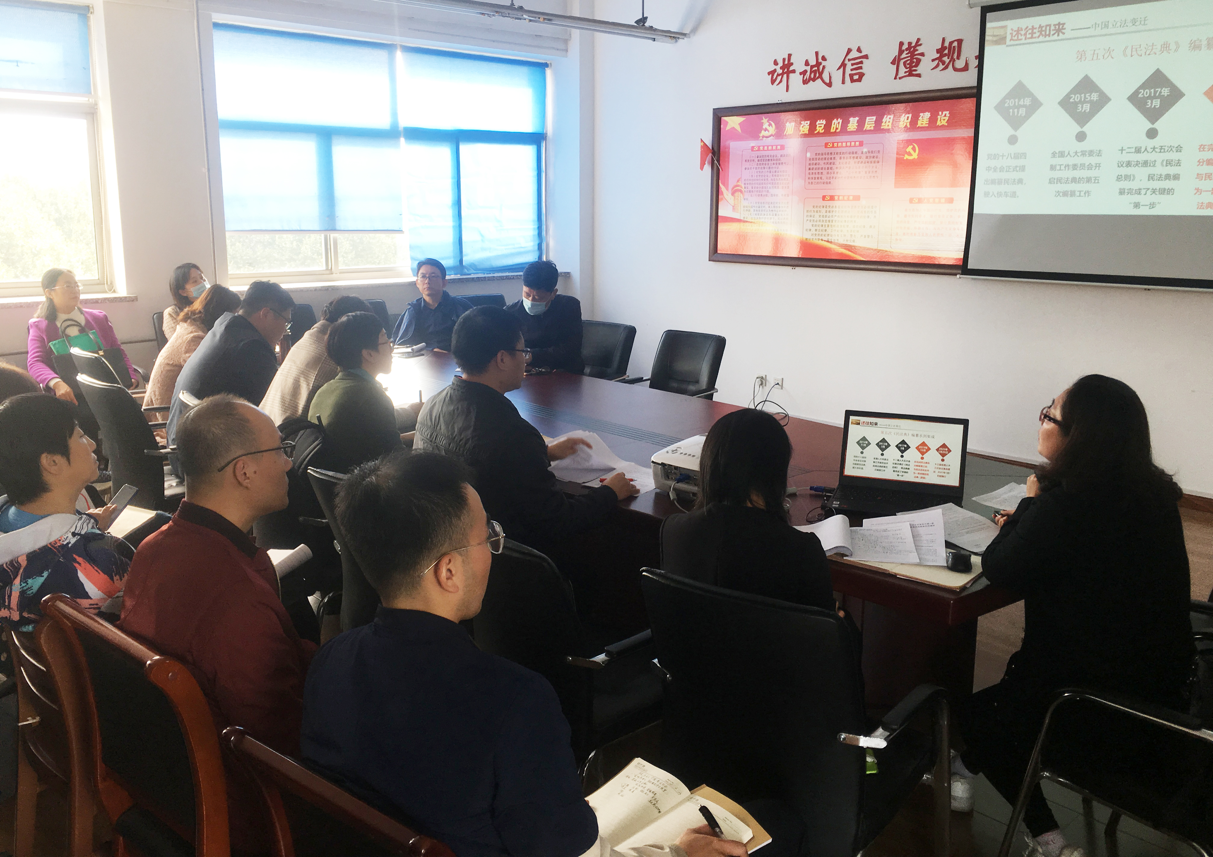 在523会议室举办民法典专题辅导报告会。学院教师李先应邀担当主讲嘉宾,学院全体在校教职工参加了本次学习。
