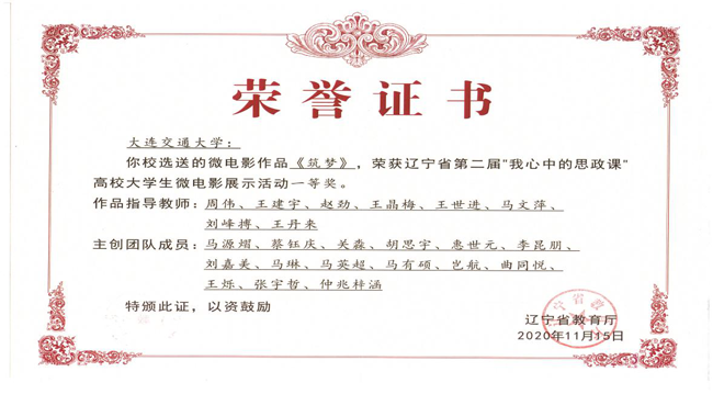 选送的思政课微电影《筑梦》在全省高校众多微电影作品中脱颖而出,荣获一等奖。