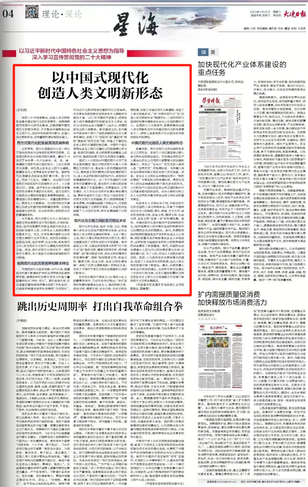 1月28日《大连日报》刊发海角网 副院长王世进撰写的理论文章《以中国式现代化创造人类文明新形态》。