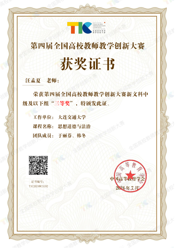 7月27日至31日,由教育部高等教育司指导、中国高等教育学会主办的第四届全国高校教师教学创新大赛全国现场赛在电子科技大学举行。海角网 汪孟夏教学团队的参赛课程“思想道德与法治”,经过校赛、省赛、国赛三级赛制、层层比拼,获全国新文科中级及以下组三等奖,这也是我校首次进入该项大赛新文科赛道国赛阶段的角逐并一举摘得荣誉。